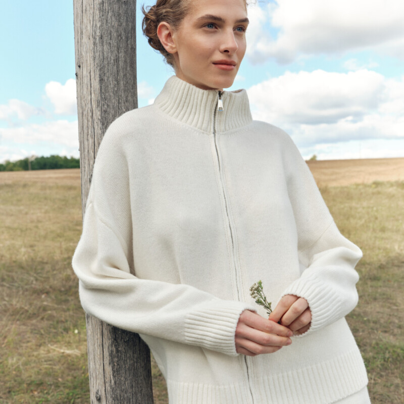 Бавовняний кардиган на двох ґудзиках, розташованих горизонтально. Модель з опущеним плечовим швом виконана з широкими рукавами та V-подібним вирізом. Кардиган представлений в класичних чорному і молочному кольорах, а також пісочному та цікавому шоколадному відтінку.