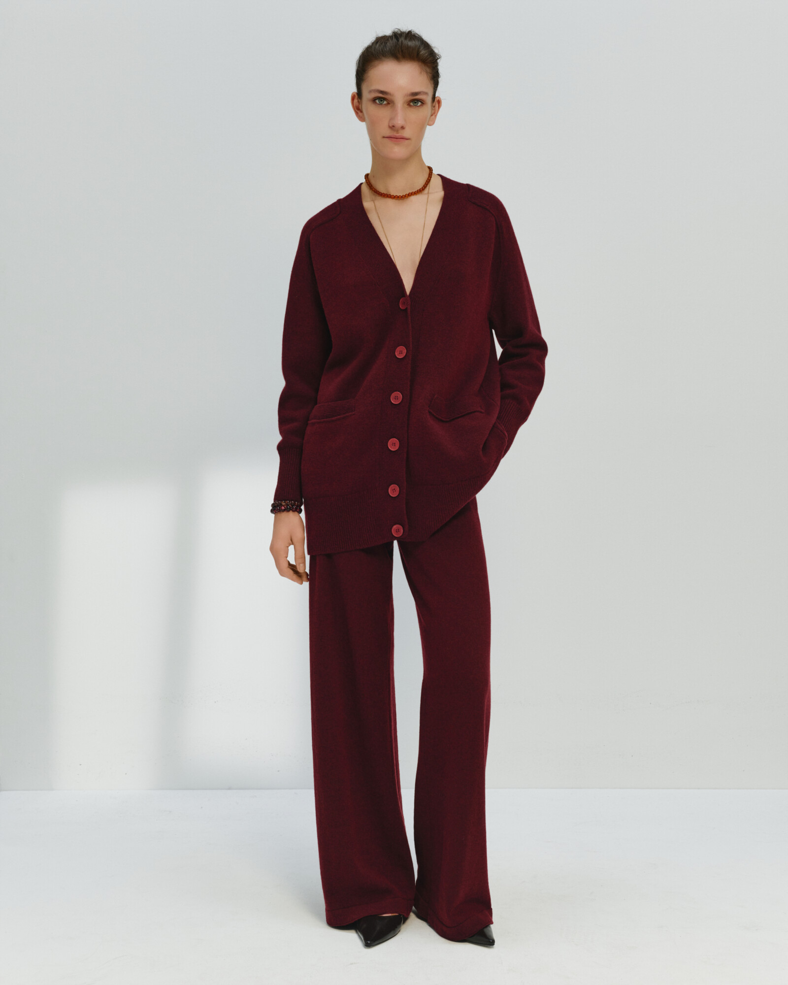 Цей костюм поєднує затишок і сучасний стиль. Подовжений кардиган вільного крою з ґудзиками спереду та зручними накладними кишенями додає образу невимушеності. Штани з прямим кроєм створюють легкий силует і забезпечують комфорт протягом дня. Чіткий крій, стриманий дизайн і гармонійна силуетність роблять його універсальним вибором для роботи, зустрічей чи важливих виходів.
