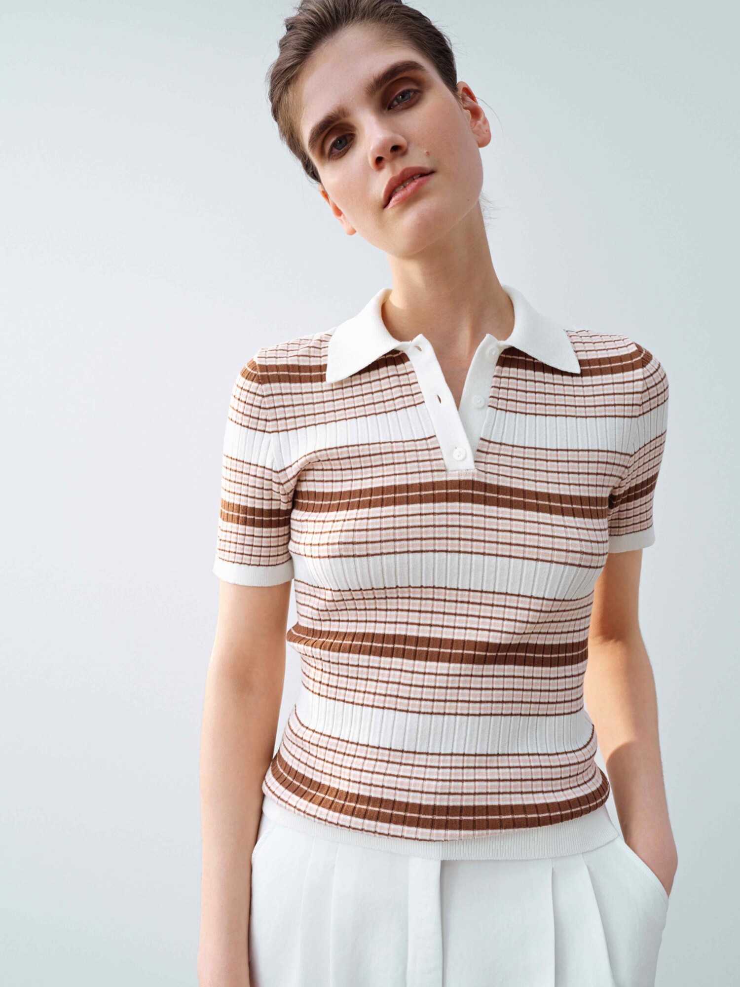 Поло NAYA з італійської пряжі у фактурній рубчиковій в’язці. Модель з класичним коміром і застібкою на ґудзики, доповнена смугастим візерунком.