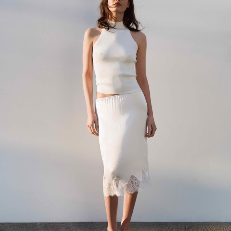 Невагома мініспідниця з високою талією на резинці. Завдяки крою та ажурній фактурі, вишукано підкреслює контури фігури. Спідниця прикрашена акцентною декоративною бахромою по нижньому краю. Виготовлена з віскози з додаванням шовку. Для створення цілісного образу, напівпрозору спідницю можна доповнити легкими шортами UNDER в тон.