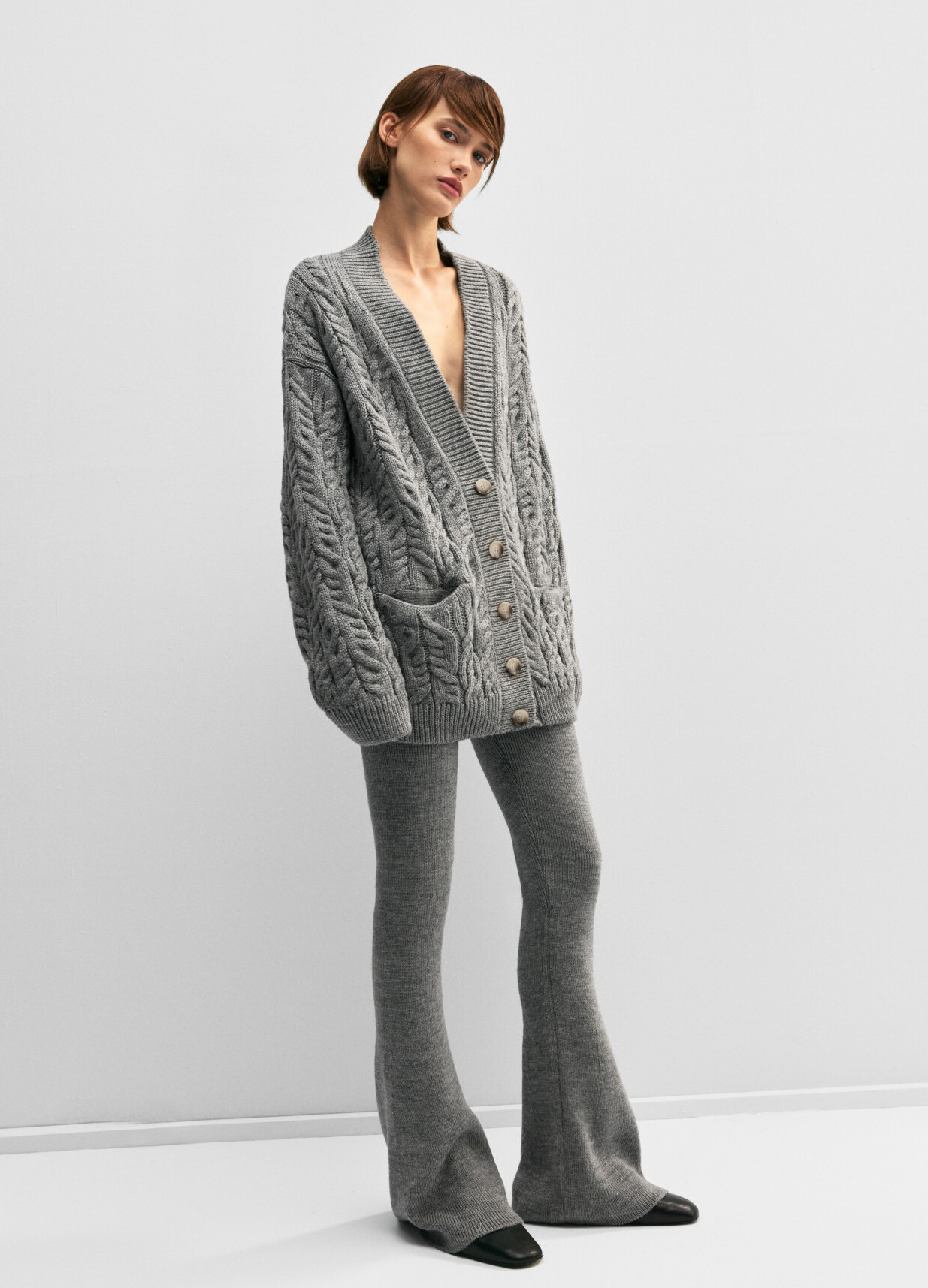 Затишний і стильний трикотажний брючний костюм з об’ємним кардиганом. Поєднання кардигана з вираженою фактурою зі штанами з кльошем від коліна створює стильний лук.