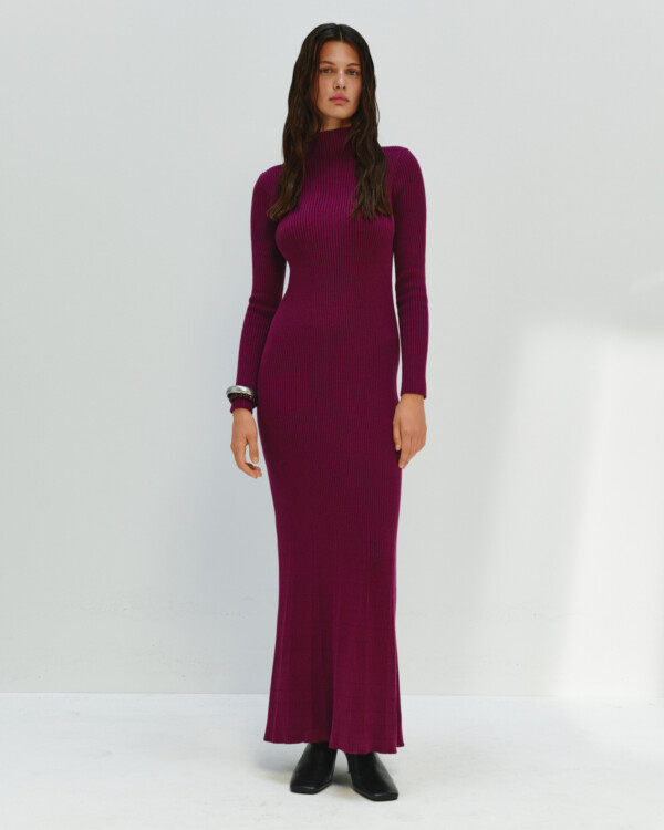 Мінімалістична максісукня з довгим рукавом та коміром-стійкою. Модель акцентно підкреслює контури фігури завдяки приталеному крою та фактурі в дрібний рубчик. Виріб доповнений декоративними збавками від коліна, завдяки яким сукня елегантно розширюється донизу.