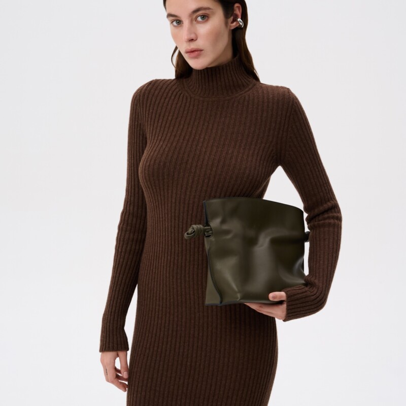 Лаконічна мідісукня з круглою горловиною, довгими рукавами та розрізом ззаду. Вбрання має приталений крій та рубчасту фактуру. Виріб мʼякий та приємний до тіла завдяки віскозі та шовку у складі.